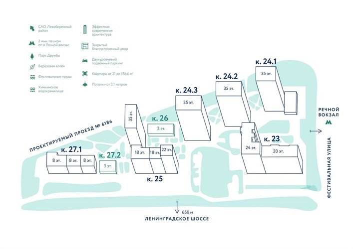 Дома бизнес-класса с монолитно-каркасным конструктивом. Жилой комплекс находится в 3 минутах ходьбы от станции метро «Речной вокзал».