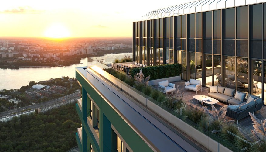 Инфраструктура: Закрытая охраняемая территория. Подземный паркинг с лифтом. Кладовые помещения для хранения. Зоны отдыха и детские площадки. Фитнес-клуб с бассейном. Школа и детский сад на территории комплекса. Магазины, кофейни и салоны красоты на первых этажах.